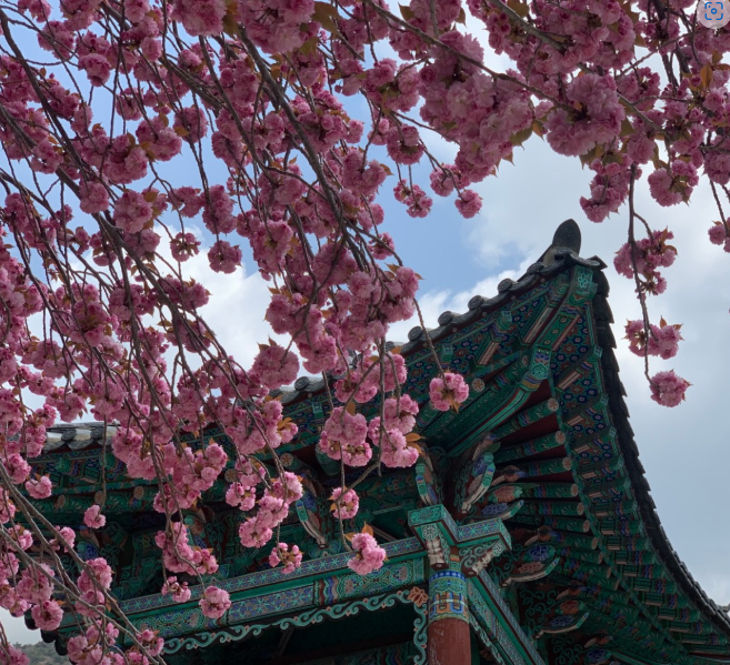- 특징: 겹벚꽃과 문화재의 이색적인 조합