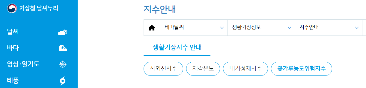 - '테마날씨' 메뉴에서 생활기상정보> 지수안내> 꽃가루 농도위험지수 제공