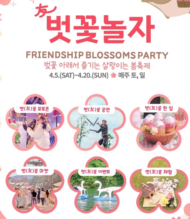 2025년 남이섬 벚꽃축제 **‘벗(友)꽃놀자’**는 친구, 연인, 가족이 함께 즐기기 좋은 다채로운 프로그램이 준비된 봄맞이 축제입니다. 야외 공연장에서는 통기타 공연, 재즈 콘서트, 마임쇼, 인디 밴드 공연 등 다양한 음악과 퍼포먼스가 펼쳐지며, 포토존과 플리마켓, 체험 부스가 운영됩니다.