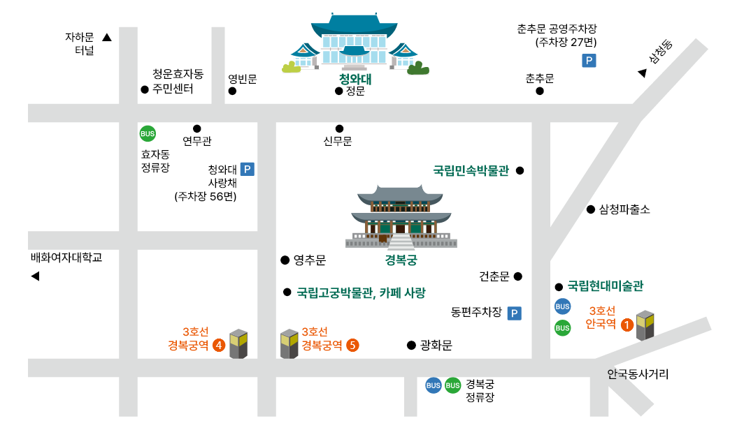 지하철을 이용하는 경우 경복궁역 4번 출구에서 도보로 약 15분이면 청와대 입구까지 도달할 수 있어 접근성도 뛰어납니다. 또한, 장애인 차량 이용 시 사전 협의 후 제한적 진입이 허용되니 참고해두면 좋습니다.