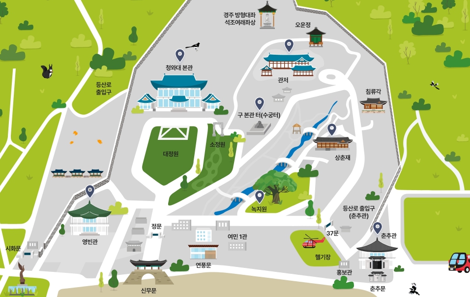 청와대 관람은 자유롭게 이동하며 진행되며, 대표적으로 본관, 영빈관, 녹지원, 상춘재, 춘추관, 헬기장, 정원 등을 둘러볼 수 있습니다. 주요 구간은 도보로 이동하며 일부 오르막 구간도 있어 편한 신발 착용이 좋습니다.