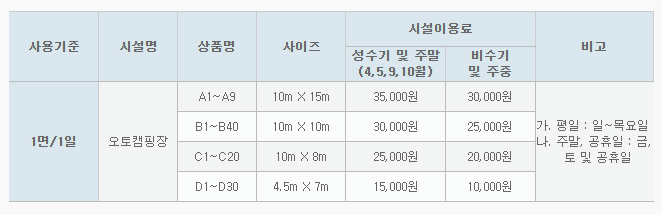 이곳의 사이트는 A, B, C, D 구역으로 나뉘며, 각 구역마다 크기와 위치, 가격이 다릅니다. D 구역은 비수기 기준 1박 1만 원으로 가장 저렴하고, A 구역은 성수기 주말 기준 3만5천 원으로 가장 고급형이에요. 가격에 따라 사이트 크기나 위치가 달라져서, 인원 수나 텐트 크기에 맞춰 선택하면 좋습니다.