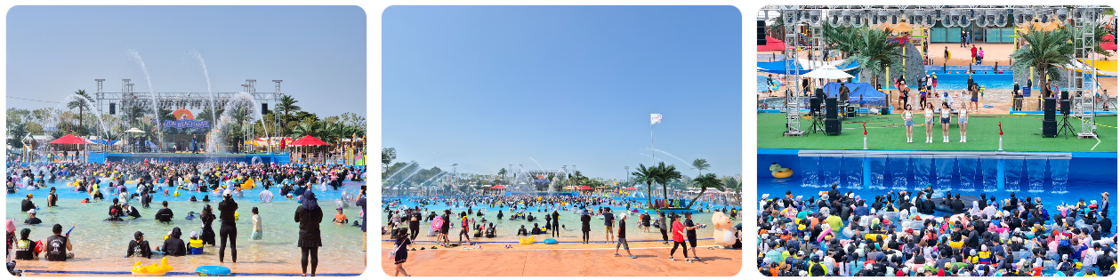 - 비치풀 : 해변처럼 수심이 점점 깊어지며, 공연 무대와 가까워 공연을 보며 물놀이를 즐길 수 있습니다. 수심 95cm, 130cm 이하 아동 구명조끼 필수입니다.