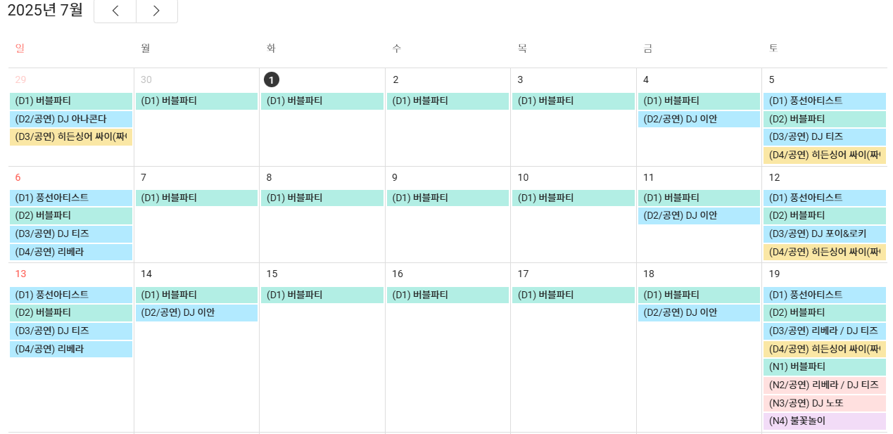 당진 아마존 워터파크는 공연과 이벤트가 다채로워 지루할 틈이 없습니다. DJ 댄스타임, 풍선아트, 버블파티, 주말 불꽃놀이까지 이어져 아이들과 부모님 모두 함께 즐길 수 있어요. 특히 7월 여행 시점에는 불꽃놀이가 진행되어 밤까지 놀기 좋습니다.