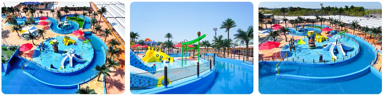- 수로풀 : 273m의 긴 코스에서 튜브를 타고 편하게 흐르는 물살을 느낄 수 있으며, 95cm 수심으로 130cm 이하 어린이는 구명조끼를 반드시 착용해야 합니다.