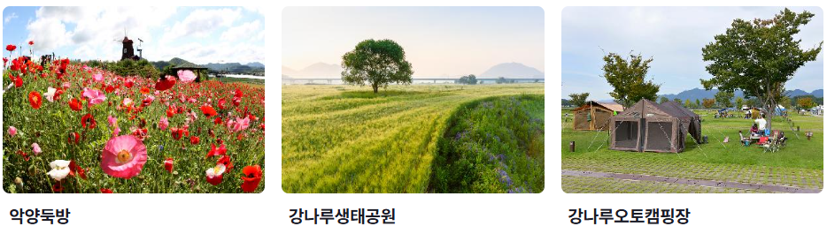 - 악양둑방: 유채꽃과 갈대숲으로 유명한 꽃길 산책 코스. 조용하고 한적한 분위기 속에서 자연을 즐길 수 있습니다.