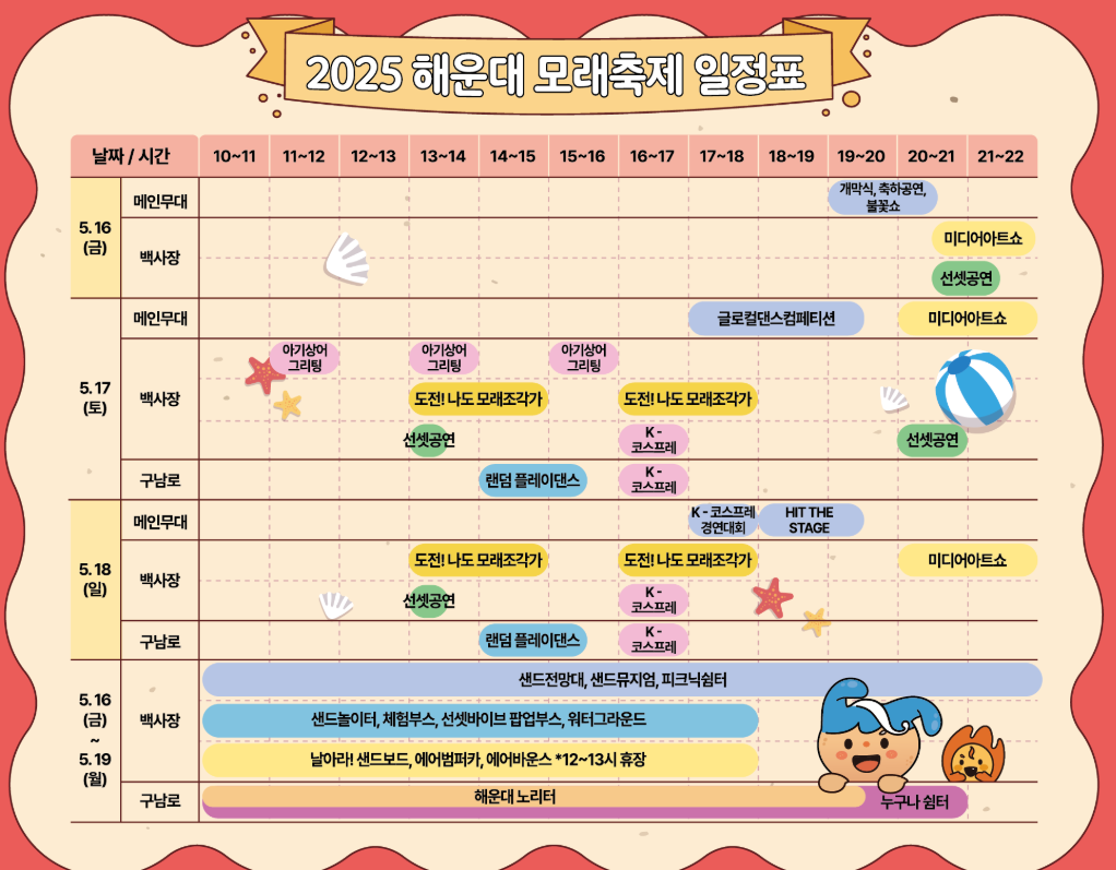 해운대 모래축제 2025는 무료로 개방되며, 모래조각 전시는 6월 8일까지 계속된다. 하지만 체험 프로그램은 5월 19일까지로 종료되므로 가족 단위 방문객이라면 축제 본 행사 기간에 맞춰 방문하는 것이 좋다.