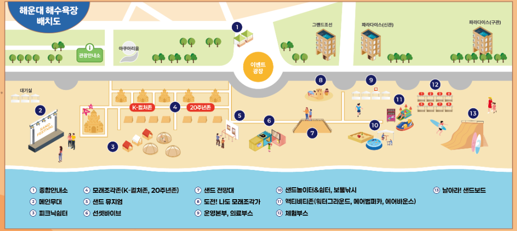 해운대 해수욕장은 축제 기간 동안 거대한 야외 갤러리로 탈바꿈한다. 2025년 해운대 모래축제의 주제는 ‘모래로 만나는 K-컬처’로, 전통과 현대를 아우르는 다양한 한국 문화를 모티브로 한 작품들이 전시된다. K-팝, K-무비, 한복, 전통 건축 등 다양한 요소가 모래 위에 새롭게 구현된다.