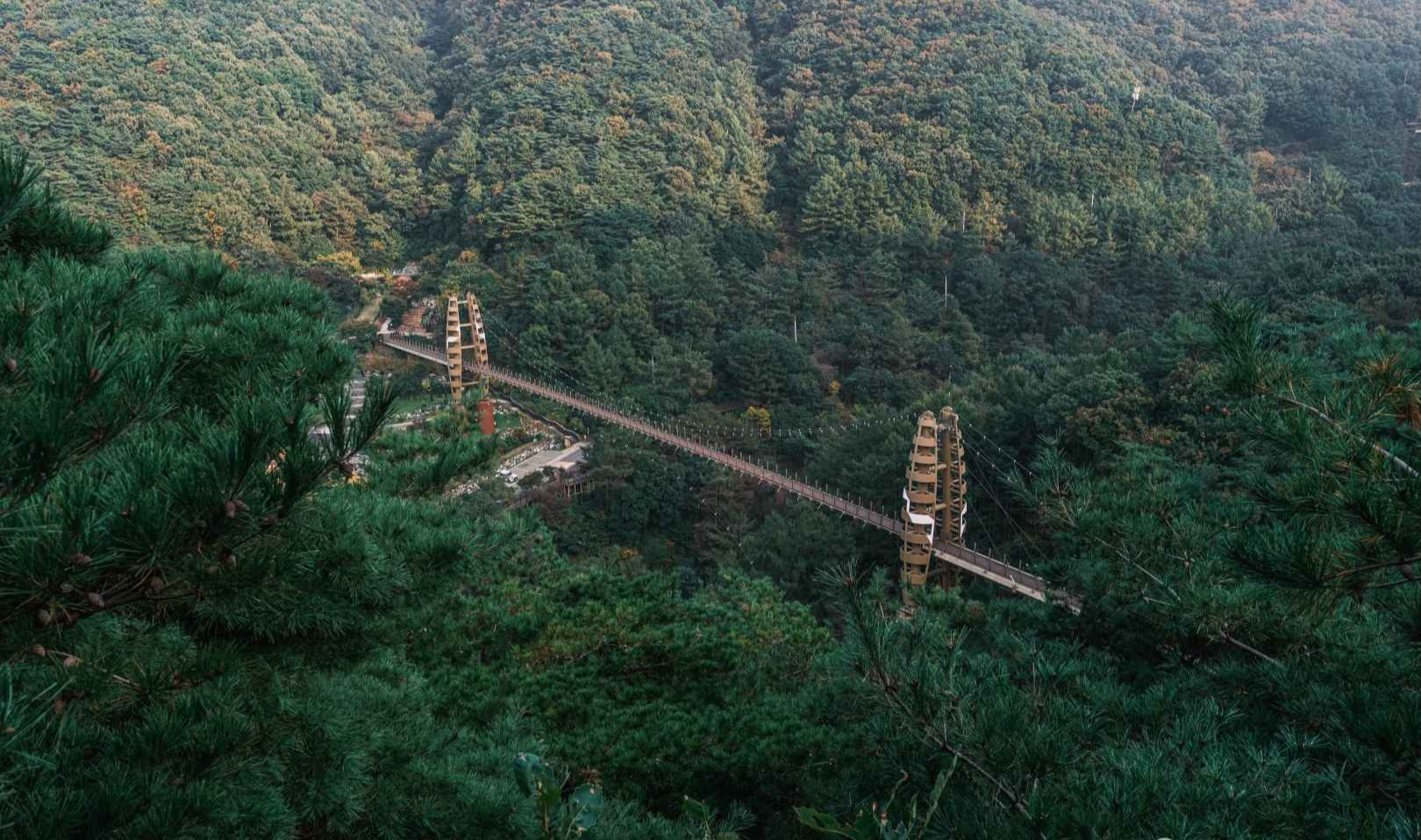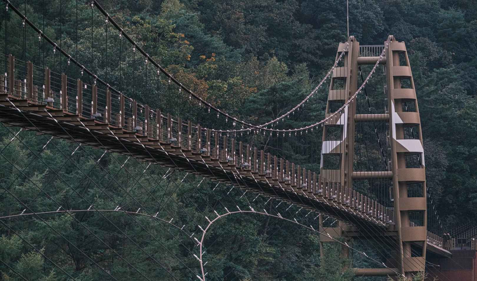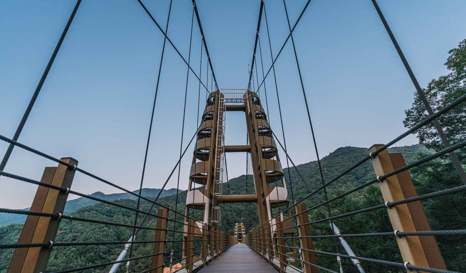 좌구산 명상구름다리는 좌구산 자연휴양림 안에 조성된 다리로, 총 길이 230m, 폭 2m 규모로 설계됐습니다. 지면으로부터 50m 높이에 설치되어 협곡을 가로지르는 장관을 선사하며, 걸을 때마다 약간씩 흔들리는 구간이 있어 심장을 두근거리게 합니다. 실제 출렁이는 구간은 130m로, 걸음을 내디딜 때마다 느껴지는 미세한 진동이 색다른 긴장감을 줍니다.