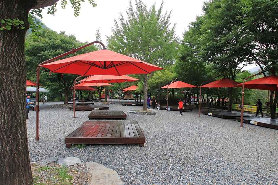 장령산자연휴양림을 따라 흐르는 금천계곡은 수심이 얕고 물이 맑아 어린이들도 안전하게 물놀이를 즐길 수 있습니다. 계곡 주변에는 평평한 바위와 그늘이 많아 돗자리를 펴고 피크닉을 즐기기에 좋습니다. 매년 7월 1일부터 8월 31일까지 물놀이장이 운영되며, 샤워장도 새롭게 마련되어 쾌적한 이용이 가능합니다.