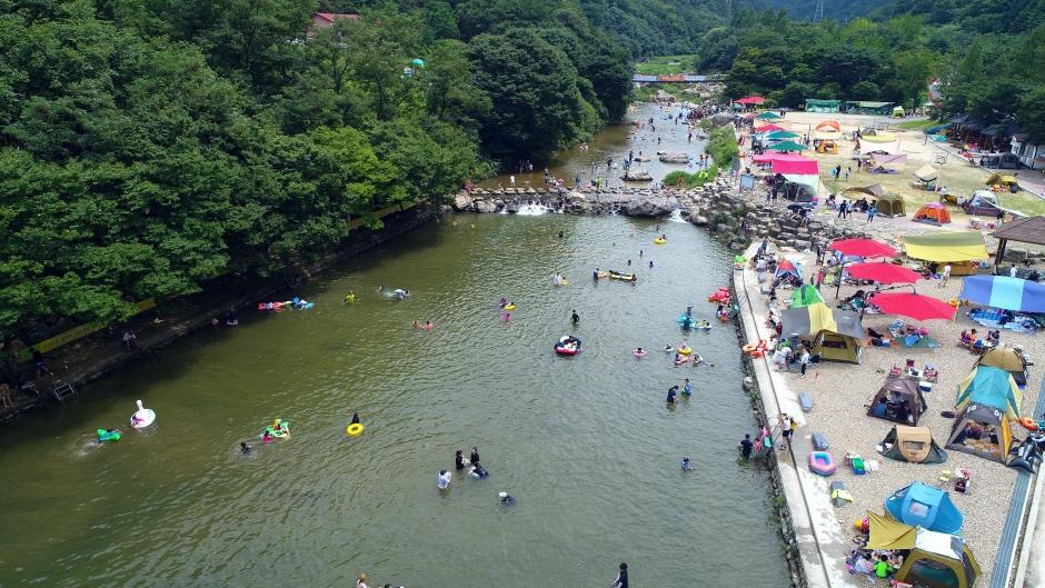 장령산자연휴양림을 따라 흐르는 금천계곡은 수심이 얕고 물이 맑아 어린이들도 안전하게 물놀이를 즐길 수 있습니다. 계곡 주변에는 평평한 바위와 그늘이 많아 돗자리를 펴고 피크닉을 즐기기에 좋습니다. 매년 7월 1일부터 8월 31일까지 물놀이장이 운영되며, 샤워장도 새롭게 마련되어 쾌적한 이용이 가능합니다.
