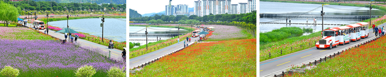 황룡강 좌우로 이어진 꽃길은 약 5km 구간에 걸쳐 꽃양귀비, 금영화, 수레국화 등 다채로운 봄꽃으로 가득 채워진다. 유채꽃이나 튤립 위주의 일반적인 봄 축제와 달리, 들꽃 느낌의 야생화 중심 구성이라 더욱 자연친화적인 풍경을 즐길 수 있다.