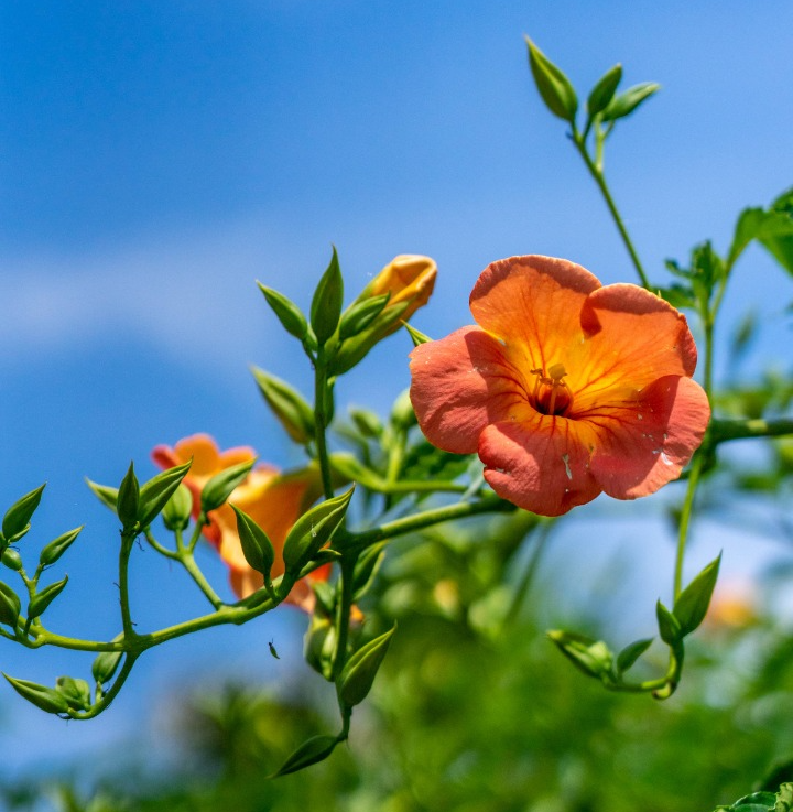 능소화는 담장을 타고 피는 꽃으로, 양반꽃이라 불릴 만큼 고귀한 분위기를 자랑합니다. 정원 안에는 능소화 외에도 수국, 버베나, 샤스타데이지 등이 함께 피어나며 다양한 여름꽃들이 정원을 채웁니다.