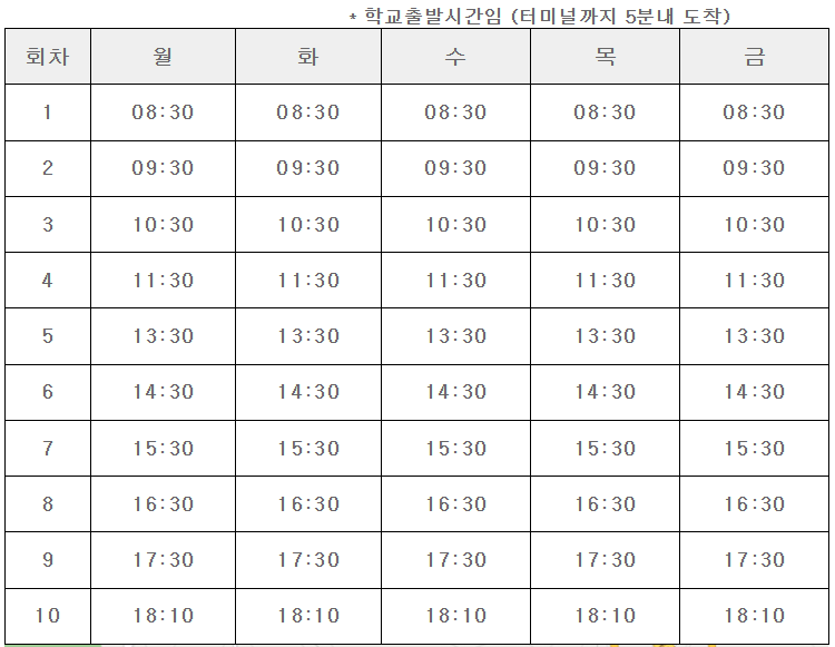 대중교통 이용 시, 괴산버스터미널에서 중원대 셔틀버스를 이용할 수 있습니다. 셔틀은 오전 8시 30분부터 오후 6시 10분까지 하루 10회 운행되며, 막차 시간은 18시 10분입니다. 이동 시간이 촉박할 경우 택시로 약 5분 거리라 이용이 편리합니다.