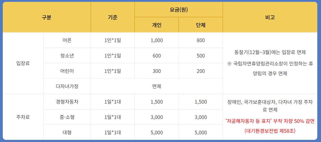 남해편백자연휴양림의 입장료는 성인 1,000원, 청소년 600원, 어린이 300원으로 비교적 부담 없이 이용할 수 있습니다. 주차 요금과 세부 요금은 숲나들e 홈페이지의 자주하는 질문 게시판을 참고하면 최신 정보를 확인할 수 있으니 참고 바랍니다.