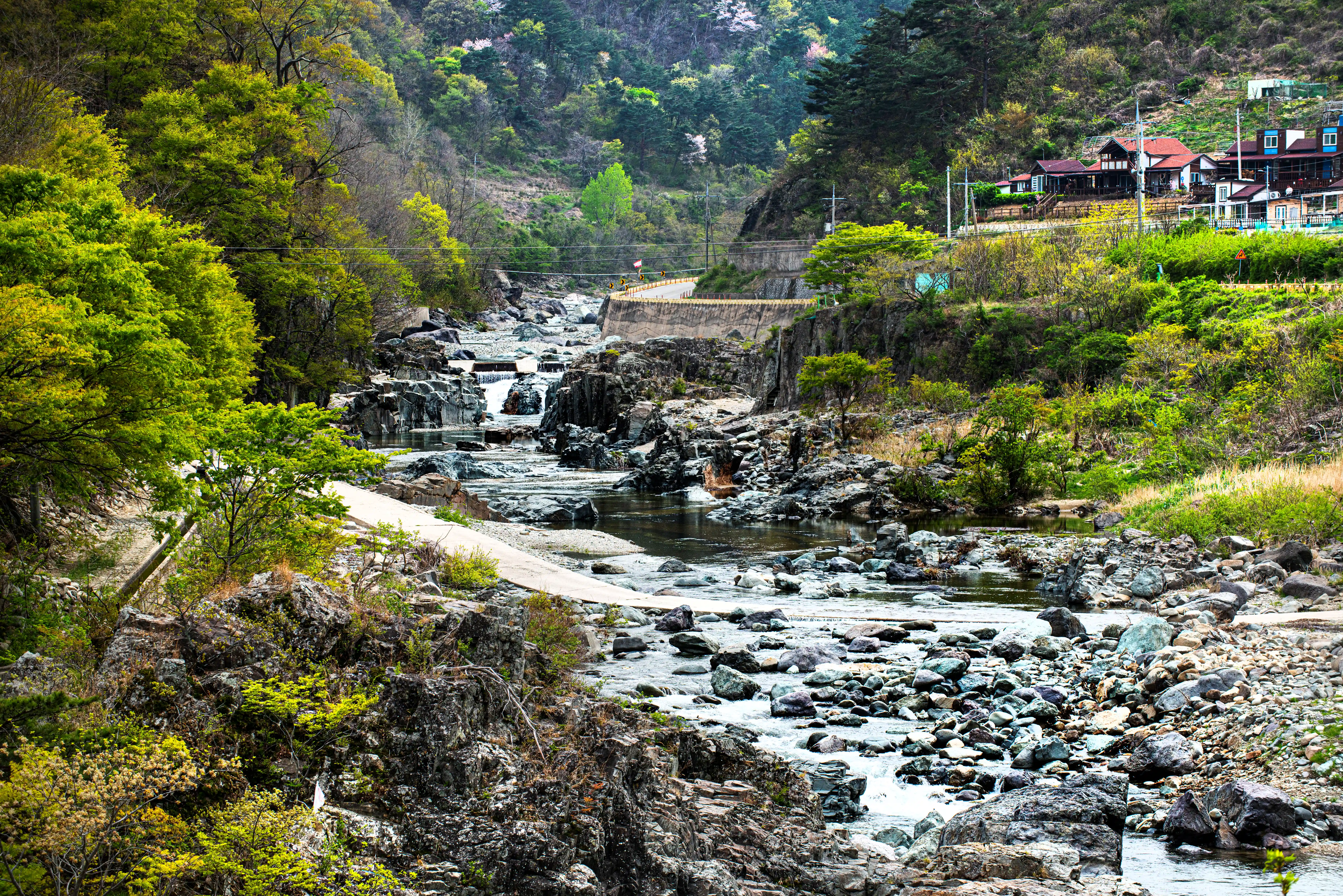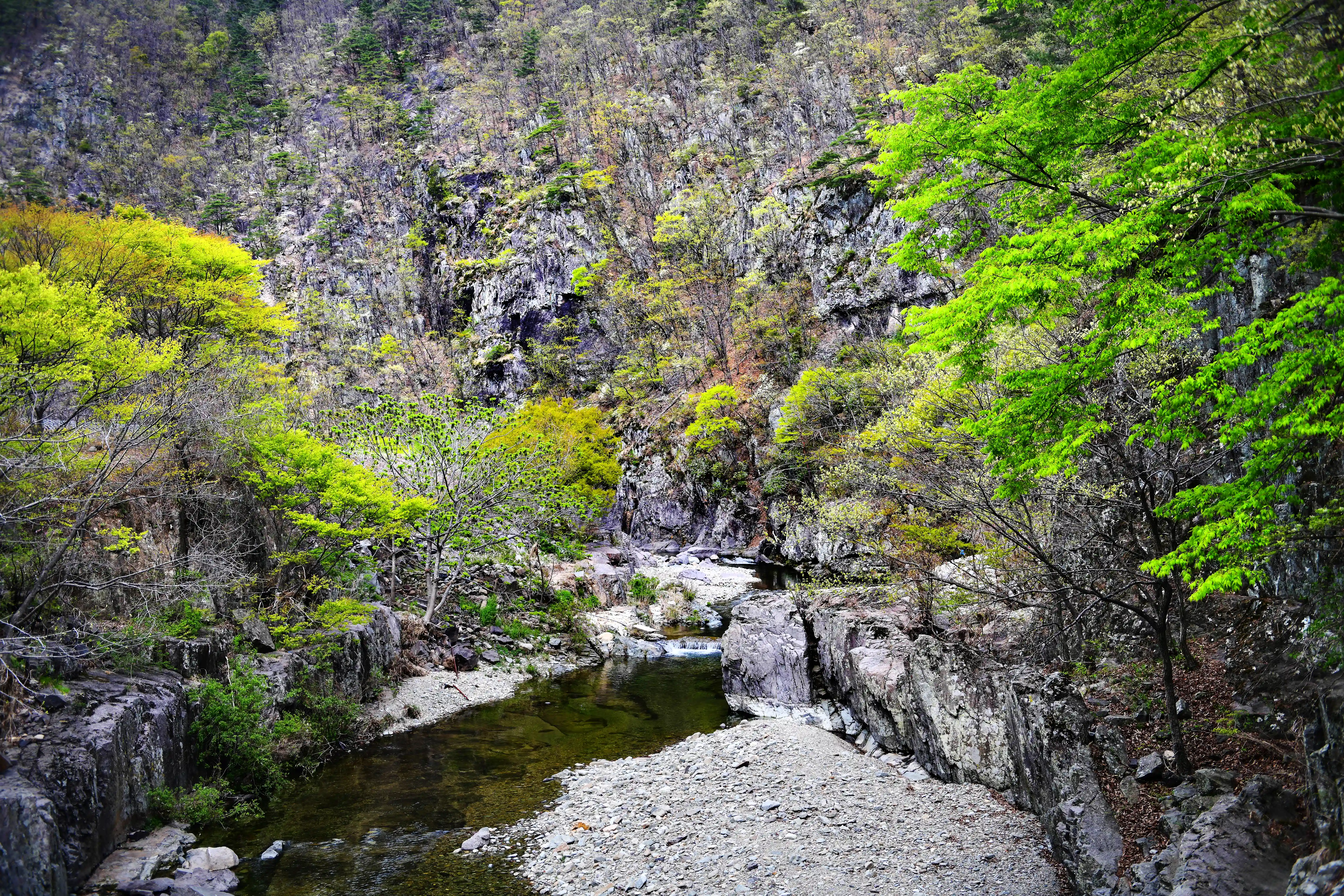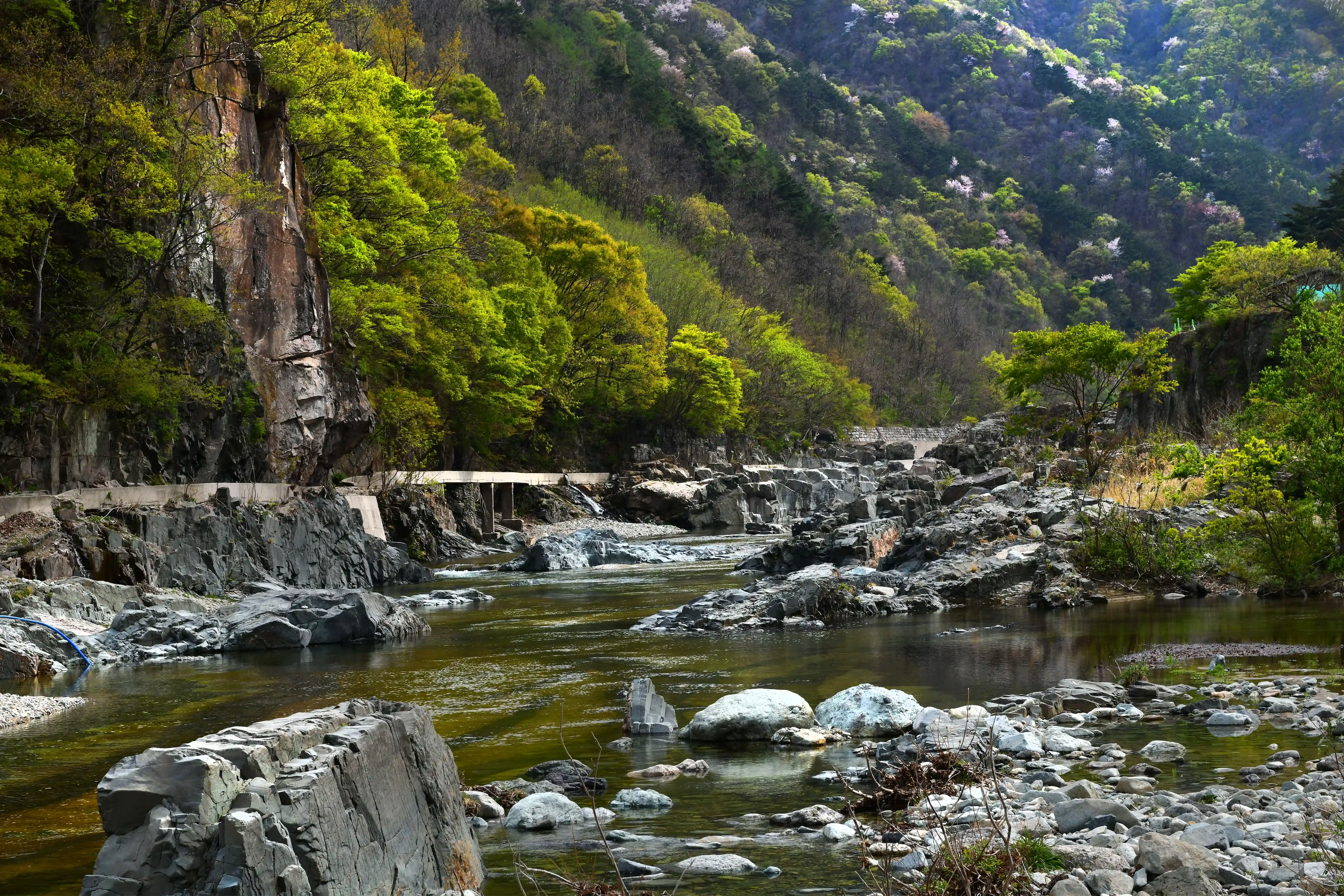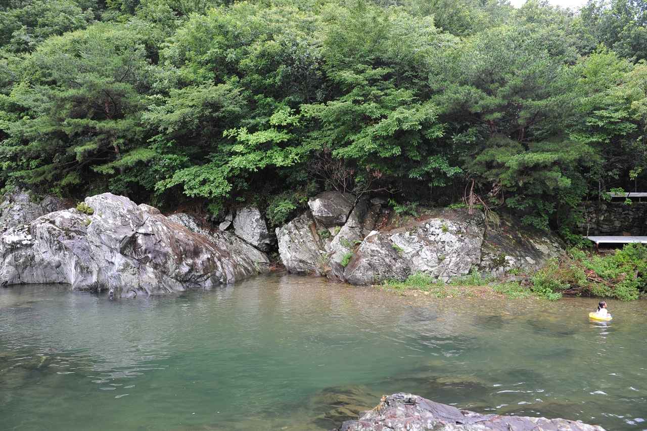 수심이 깊지 않고 유속도 완만한 편이라 아이들과 함께 놀기에도 안전합니다. 바닥까지 보일 정도로 맑은 물에는 작은 물고기들도 살아 움직이고 있어서 자연 체험 장소로도 좋아요. 바위 사이사이로 흐르는 물줄기와 그 위로 드리운 나뭇잎 사이 햇빛이 만들어내는 풍경은 여름 산수화를 보는 듯한 느낌이 들 정도입니다.