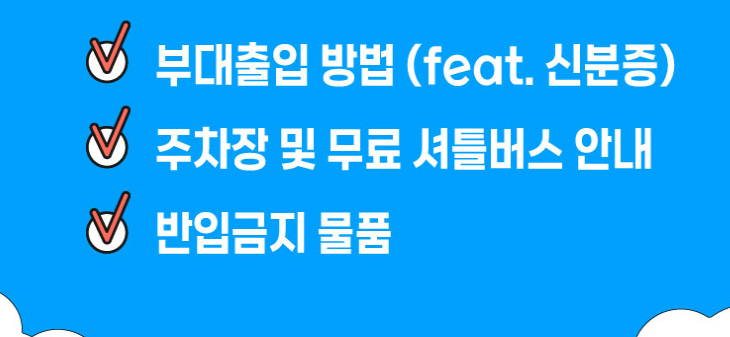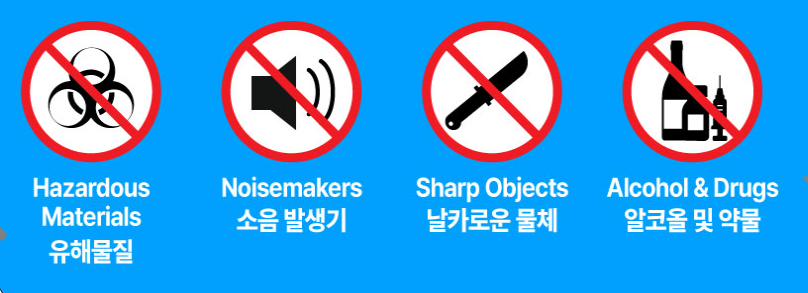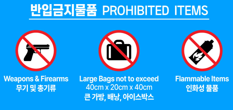또한 반입 금지 품목이 많아 사전 확인이 필수다. 대형 가방, 우산, 애완동물, 드론, 전동킥보드 등은 절대 반입이 불가하다. 특히 우산은 보안상 위험 품목으로 간주되므로, 우비를 준비하는 것이 좋다.