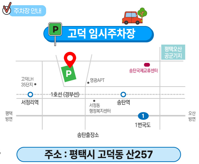 가장 효율적인 이동 방법은 대중교통 + 도보 또는 셔틀 조합이다. 평택역이나 송탄역에서 하차 후 도보나 셔틀을 이용하면 주차 걱정을 덜 수 있다.