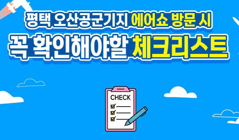 오산 에어쇼는 무료 행사지만, 17세 이상 관람객은 유효한 신분증을 반드시 소지해야 입장이 가능하다. 입장 시 보안 검사가 철저히 이루어지며, 출입은 ‘모린 게이트’를 통해서만 가능하다.