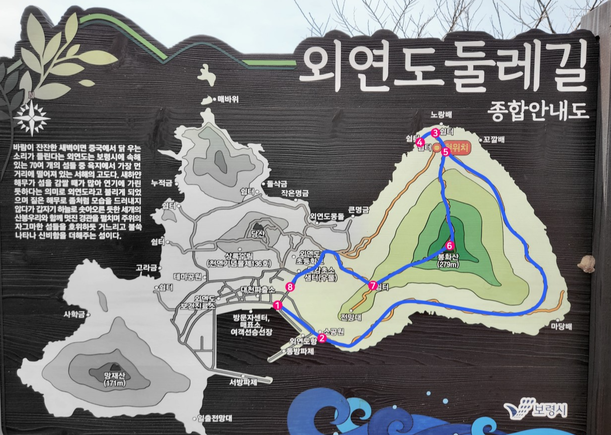 외연도에는 봉화산(279m), 망재산(171m), 당산(73m) 총 세 개의 산봉우리가 있고, 중심 마을을 둥글게 둘러싸고 있어 어디서든 오르내리는 코스가 가능합니다. 시간 여유가 있다면 망재산까지 트레킹을 확장하는 것도 추천됩니다.