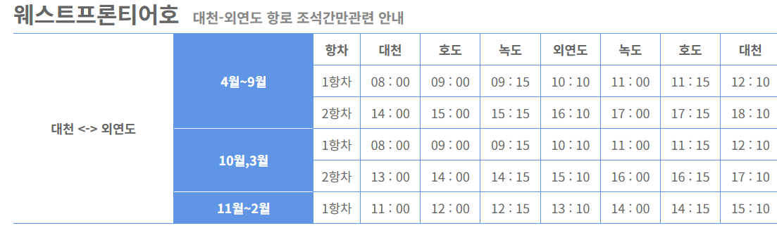 외연도는 대천항 연안여객터미널에서 출발하는 쾌속선을 이용해 약 1시간 30분 만에 도착합니다. ‘웨스트프론티어호’는 하루 두 차례 운항되며, 정확한 외연도 배 시간표는 출항일 기준으로 신한해운 예매 페이지 또는 터미널에서 실시간 확인이 필요합니다.