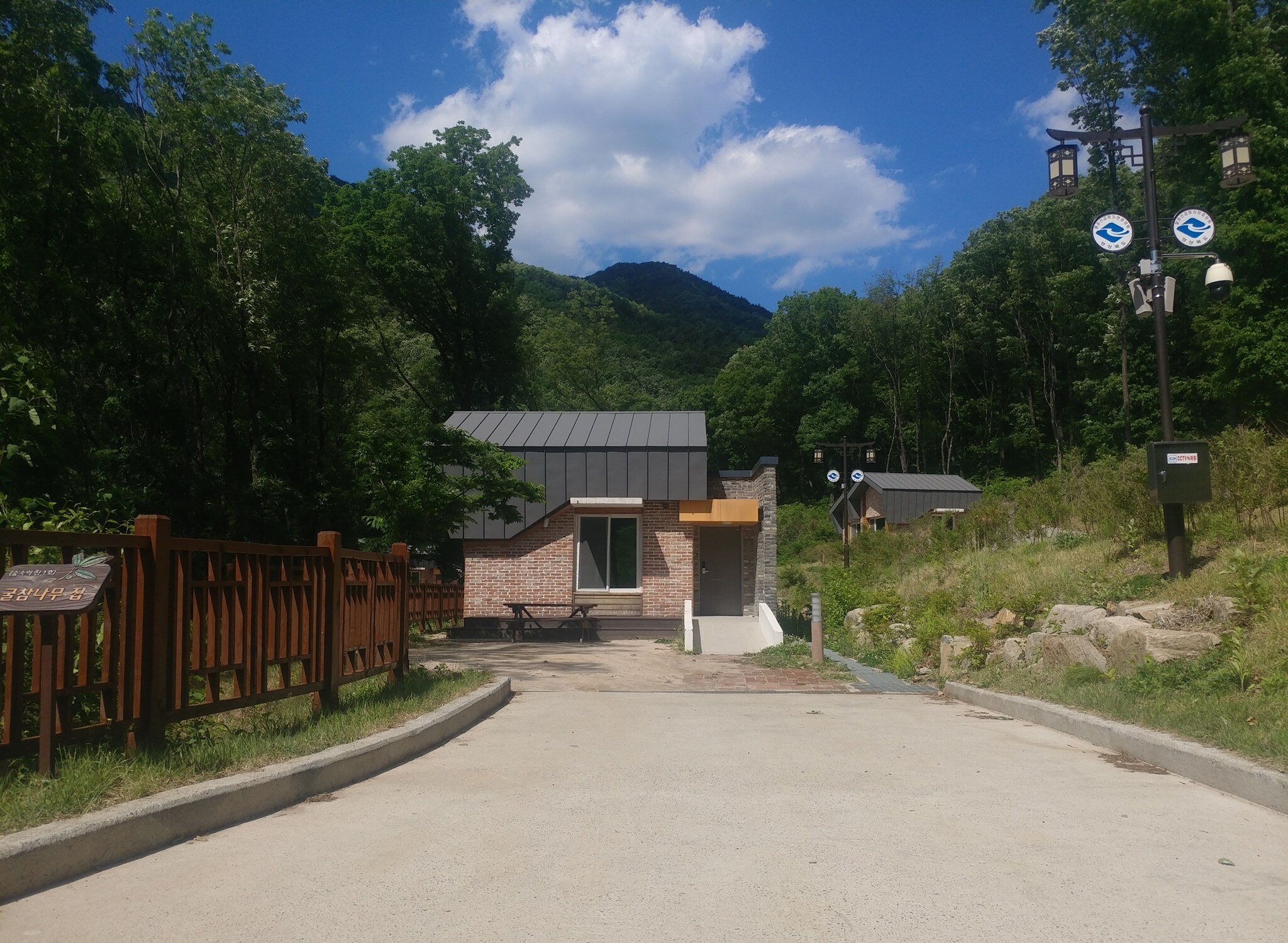 휴양림은 팔공산 자락 깊숙이 들어와 있어서 도시 소음이 전혀 들리지 않아요. 입구를 지나 조금 더 올라오면 체크인 센터가 나오고, 숙소 앞에는 잔디밭과 놀이터, 농구장, 축구장 등이 마련돼 있습니다.