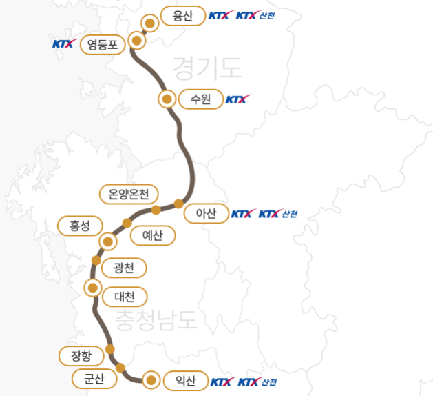 - 용산 → 영등포 → 수원 → 아산 → 온양온천 → 예산 → 홍성 → 광천 → 대천 → 장항 → 군산 → 익산