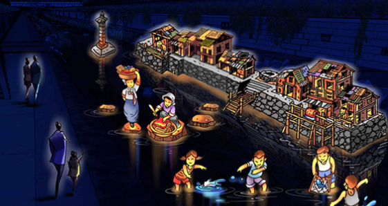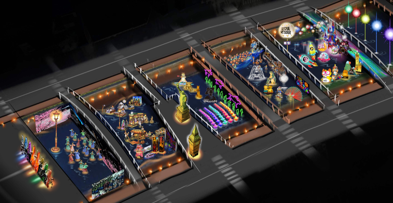 청계천 1구역은 Miracle Seoul이라는 이름으로 기적처럼 펼쳐진 서울의 빛이라는 콘셉트가 중심을 이룹니다. 청계광장에서 장통교 사이에 구성되며 황금빛 계열의 환영 조형이 중심을 이룹니다.