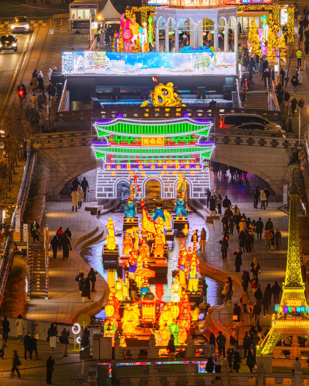 이어지는 2구역과 3구역은 테마에 따라 색감과 조명 분위기가 빠르게 변화하는데, 구역마다 포토존이 명확히 존재해 이동 중 자연스럽게 멈추게 되는 구성이 많습니다. 마지막 4구역은 전체 구간 가운데 조명 깊이가 가장 짙게 연출되어 조용히 관람하기 좋은 편입니다. 반대로 사람 많은 시간대를 피하고 싶다면 구역을 거꾸로 이동하는 방법도 있는데 초반에 광통교나 모전교 쪽에서 진입하면 상대적으로 여유롭게 감상할 수 있습니다.