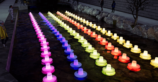 우이천 5구역 Soul Light는 시간이 흐르는 서울의 빛이라는 테마로 과거와 현대를 연결하는 조형물이 배치되어 있으며 상대적으로 고요한 분위기 속에서 조명을 감상할 수 있는 구간입니다.