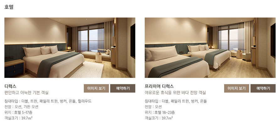 호텔동은 디럭스부터 시그니처 스위트까지 다양하게 구성되어 있으며, 조식 패키지와 키즈룸이 제공돼 가족 단위 여행객이나 커플에게 적합합니다.