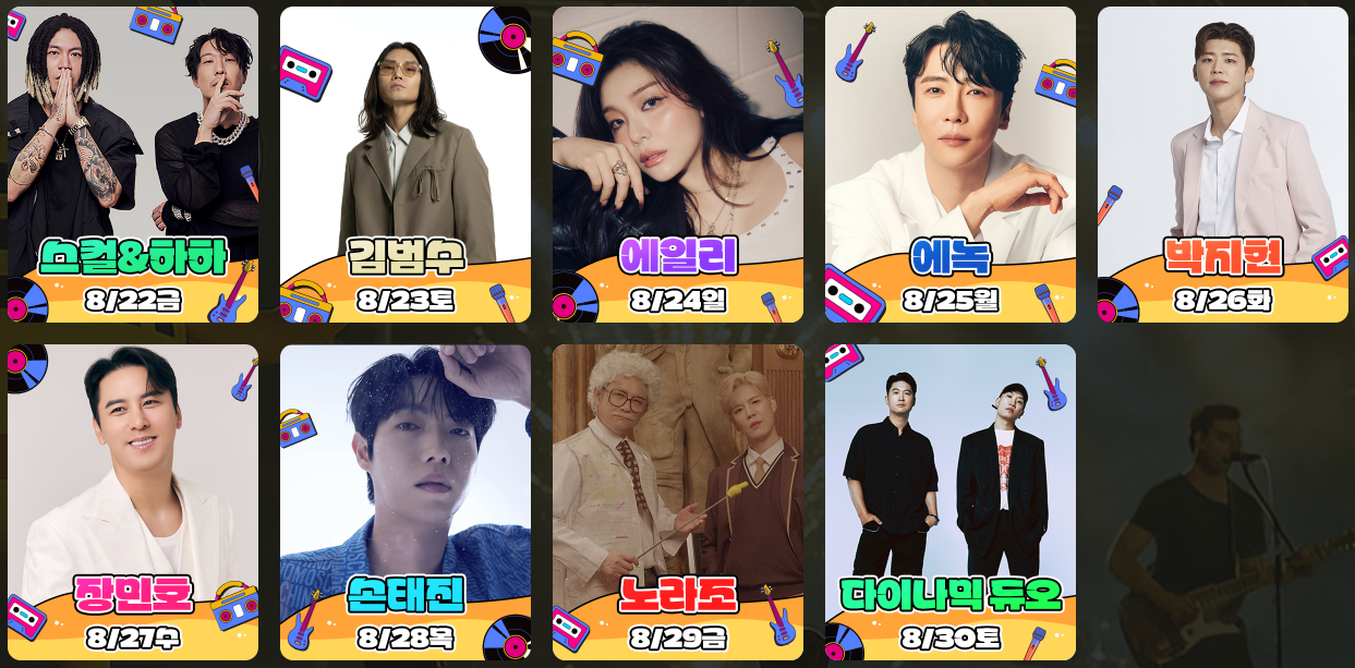 올해 라인업은 그야말로 ‘종합선물세트’입니다. 세대를 아우르는 인기가수들이 매일 밤 9시 공연을 펼칠 예정이에요.