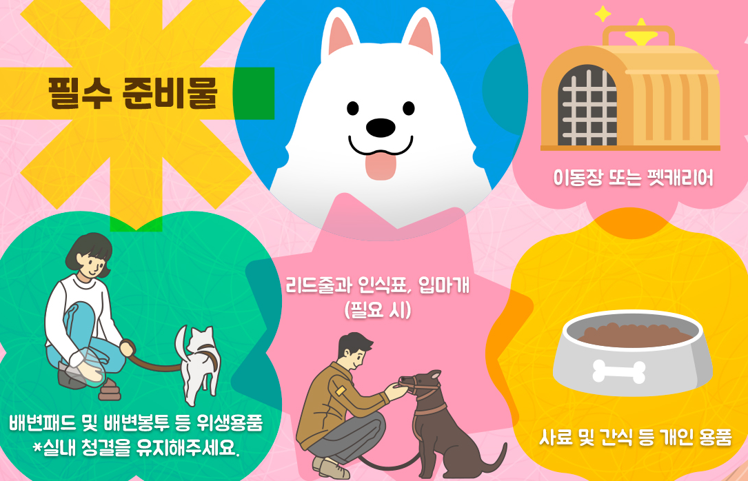 이 외에도 리드줄, 간식, 배변패드, 인식표, 필요 시 입마개 등은 보호자가 직접 준비해야 합니다.