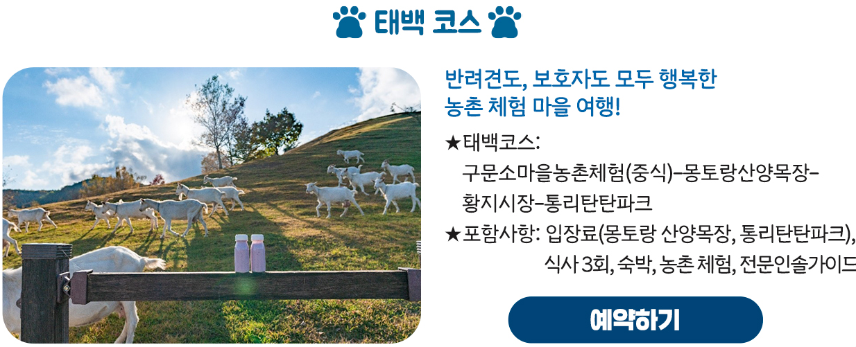 자연 체험을 좋아하신다면 태백 코스를 추천합니다. 구문소마을, 황지연못, 통리탄탄파크, 몽토랑 산양목장 등 체험 위주의 장소들로 구성되어 있고, 반려견과 함께하는 ‘컵 만들기 체험’도 포함되어 있어 액티비티를 좋아하는 분께 적합합니다.