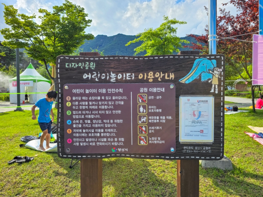 디자인공원 물놀이장은 7세 이하 어린이의 경우 보호자 동반 하에 이용이 가능합니다. 또한 기저귀를 착용하는 아이라면 반드시 방수 기저귀를 착용해야 합니다. 자전거, 인라인, 킥보드 등 바퀴 달린 기구의 출입은 금지되어 있어 안전하게 물놀이할 수 있습니다. 현장에는 안전요원이 상주하고 있어 사고 발생 시 빠르게 대응할 수 있는 점도 매우 인상 깊었습니다.