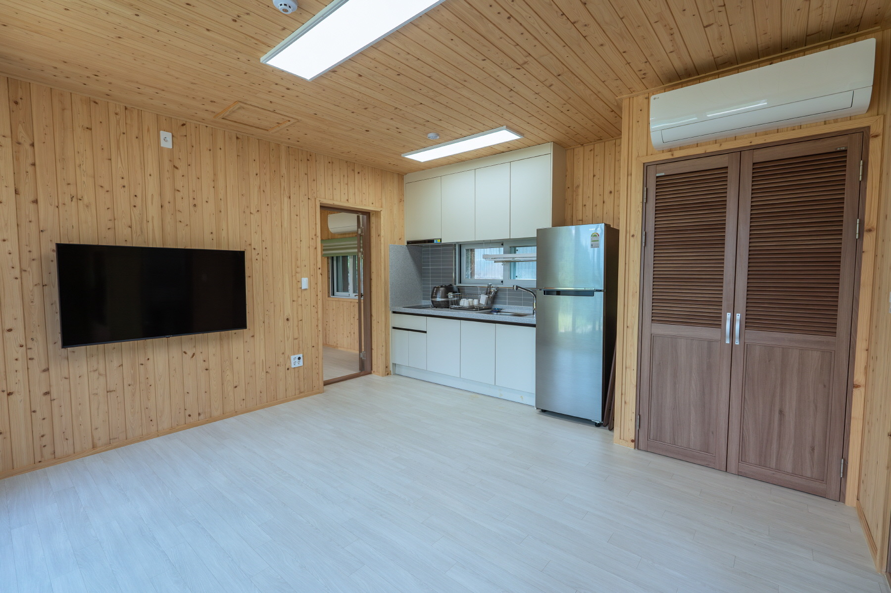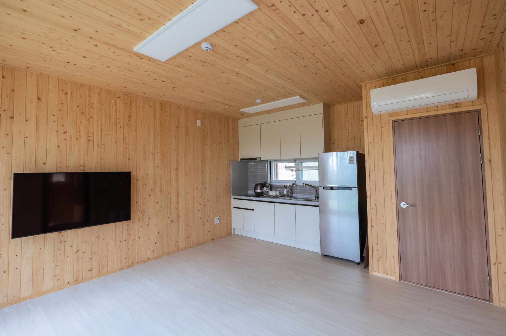 영암 기찬 자연휴양림의 대표 숙박시설 중 하나인 숲속의집 월출관 4호는 기준 5인, 최대 5인까지 이용 가능한 36㎡ 규모의 원룸형 숙소입니다. 거실 겸 주방, 화장실이 함께 구성된 실속 있는 구조로, 가족이나 소규모 그룹이 편리하게 묵을 수 있습니다. 통창을 통해 햇살이 잘 들어와 밝고 쾌적하며, 오후 3시부터 입실하고 오전 11시까지 퇴실하면 됩니다. 침구류는 깨끗하게 관리되고 있으며, 바닥이 불편한 분들을 위해 매트도 비치되어 있습니다. 에어컨과 보일러가 갖춰져 있어 여름과 겨울 모두 편안하게 머물 수 있습니다.