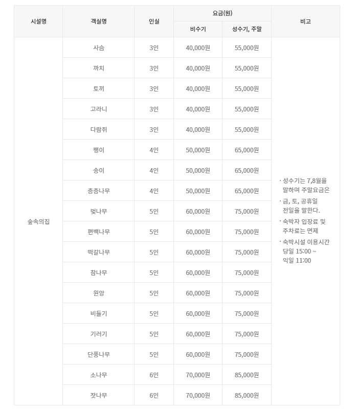 영인산 자연휴양림은 아산 시민과 천안 시민에게는 입장료가 면제되며, 일반 성인은 2,000원, 청소년 및 어린이는 1,000원의 입장료가 있습니다. 주차료는 1일 3,000원이며, 숙박 시설은 사전 온라인 예약이 필수입니다. 특히 ‘숲속의 집’은 주말과 공휴일 기준으로 조기 마감되는 경우가 많아 미리 예약을 진행하는 것이 좋습니다.